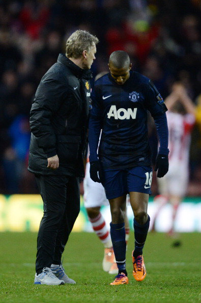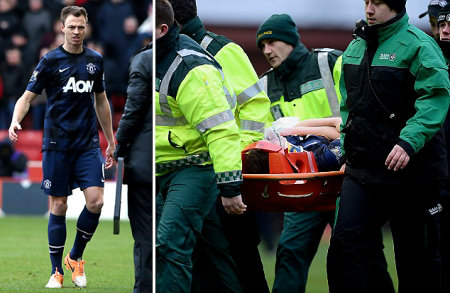 จอนนี่ อีแวนส์ (ซ้าย) เดินกระเผลกออกจากสนาม ส่วน ฟิล โจนส์ โดนหาม